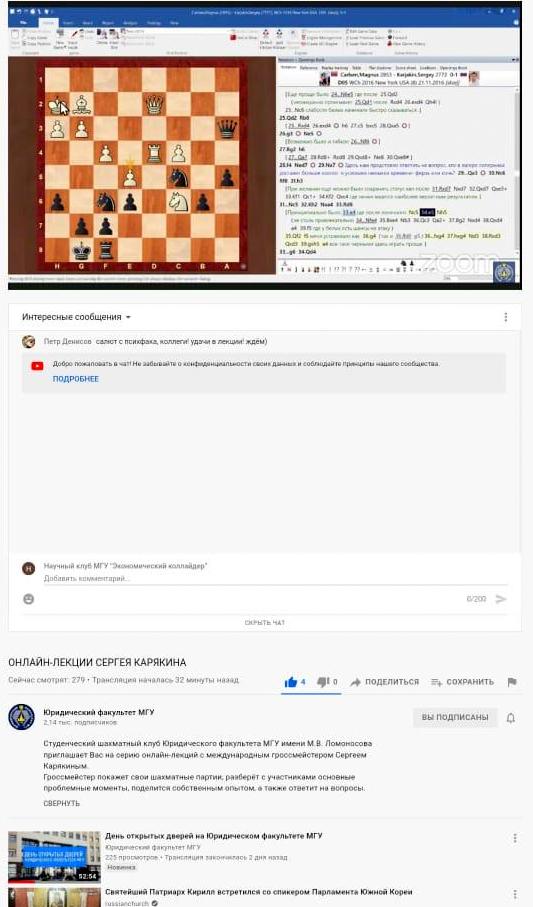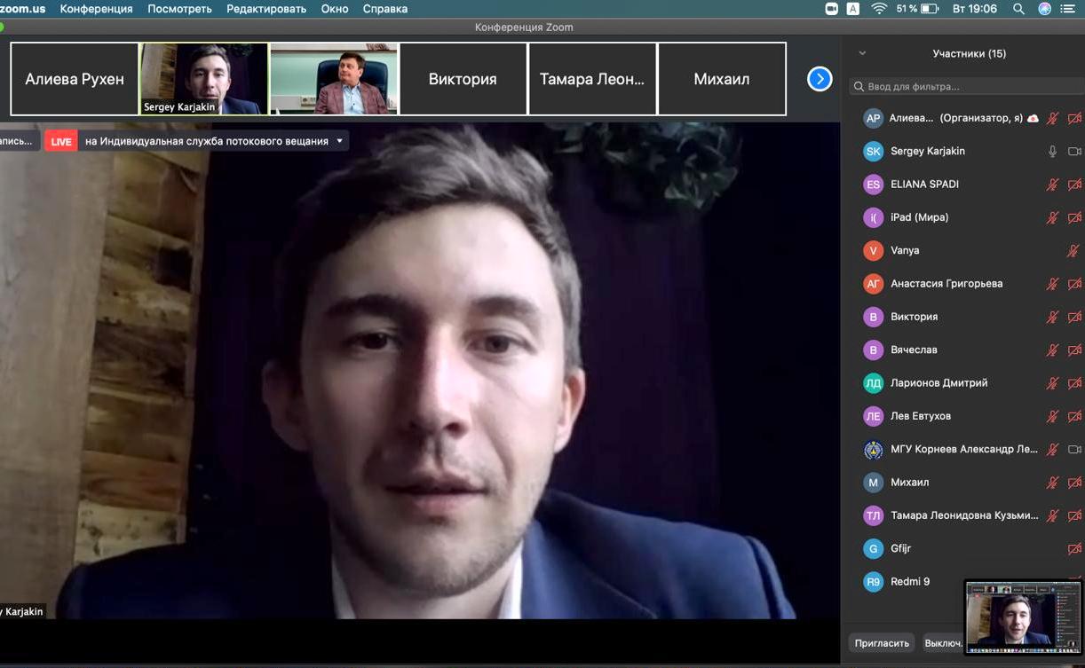 25 мая 2021 г. по инициативе президента Студенческого шахматного клуба Юридического факультета МГУ А.Л. Корнеева состоялась онлайн-встреча международного гроссмейстера Сергея Карякина со старшеклассниками и абитуриентами Московского государственного университета имени М.В. Ломоносова.