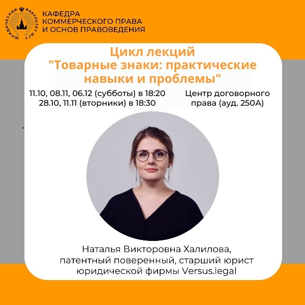 - 8 ноября (суббота), 18:20 — «Практика регистрации и поиска товарных знаков» (студенты потренируются делать предварительные проверки, обсудят основания для отказа в регистрации);