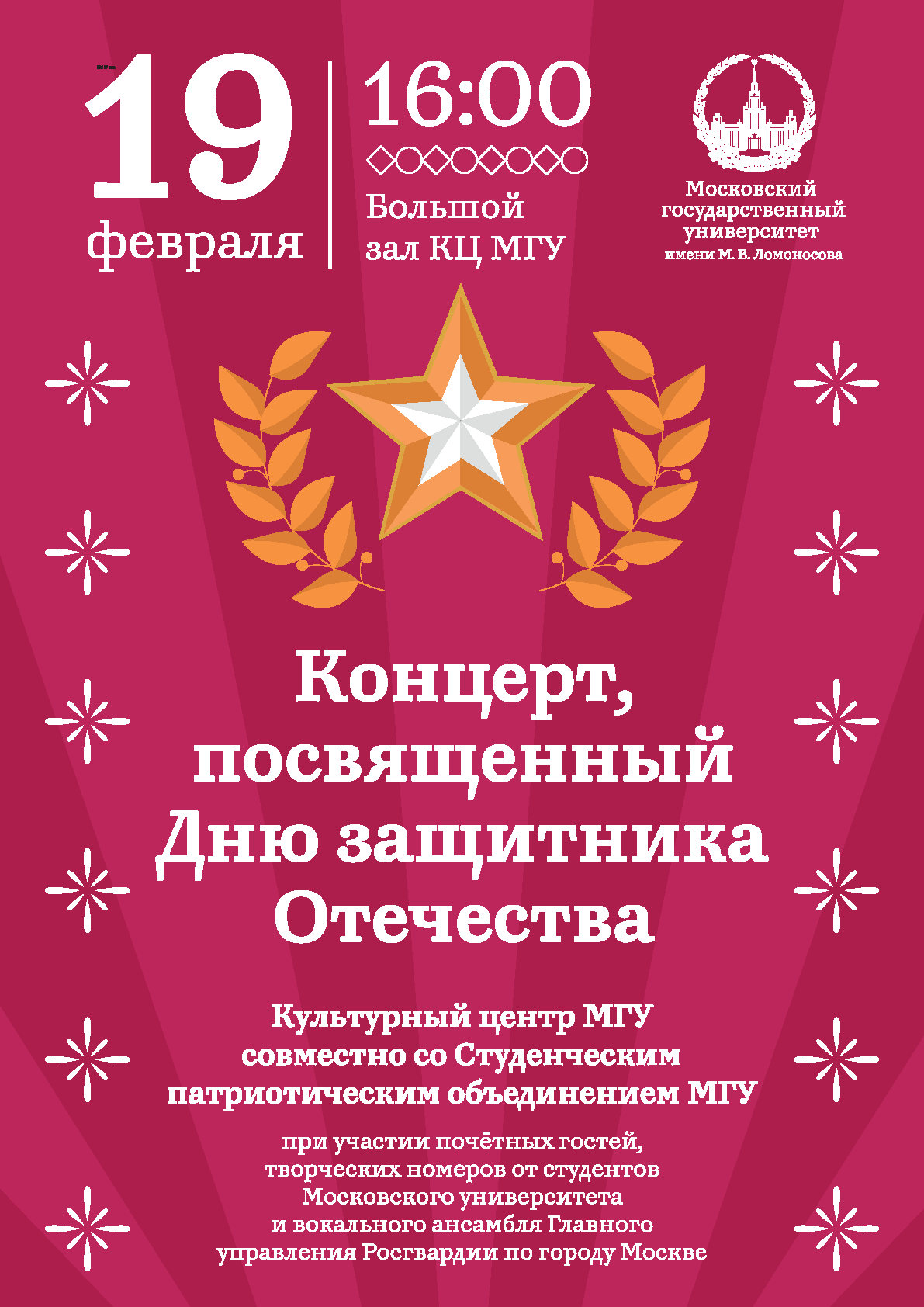 19 февраля 2026 г. в 16:00 в актовом зале Дома культуры МГУ состоится патриотический концерт ко Дню защитника Отечества.