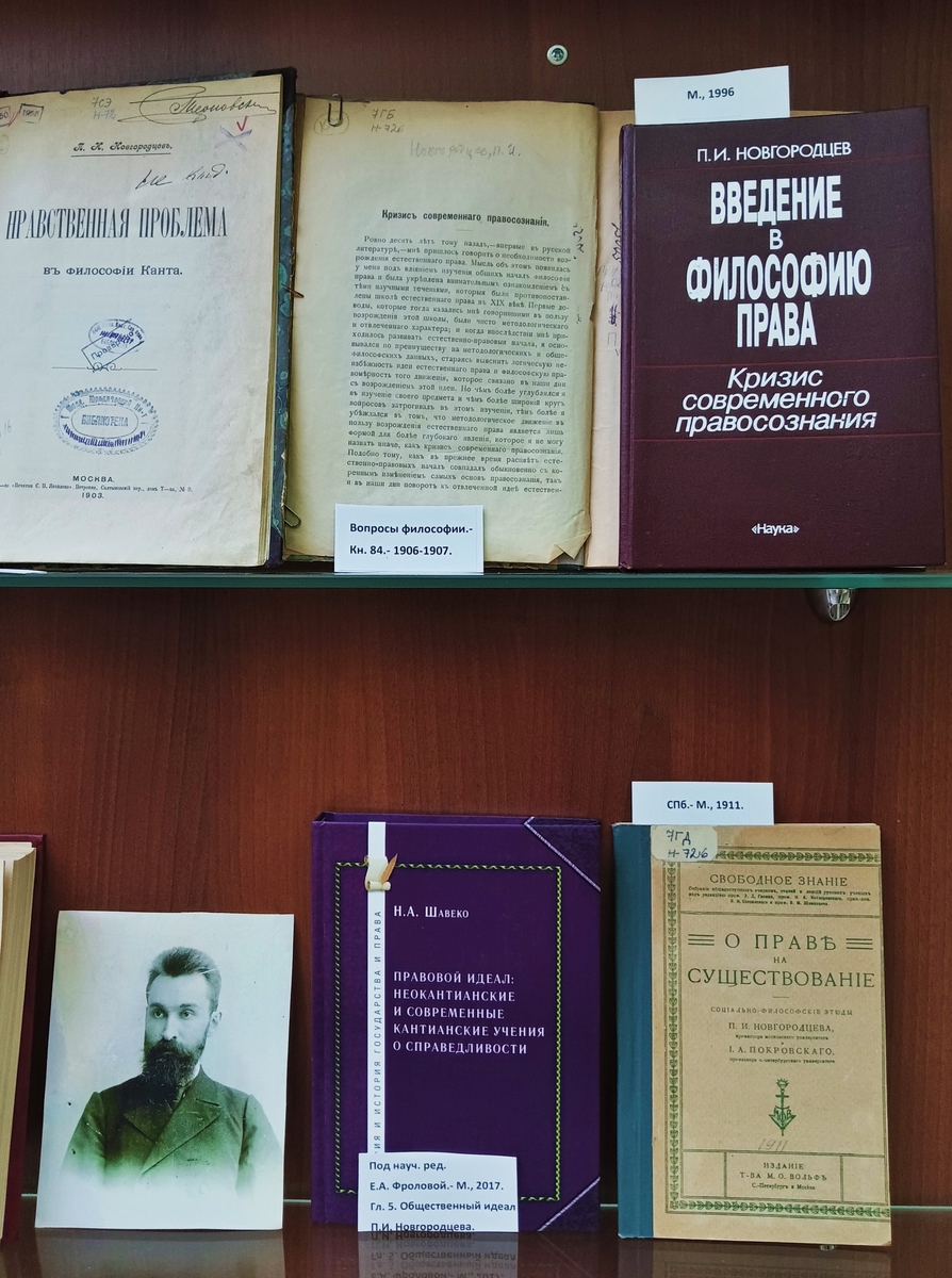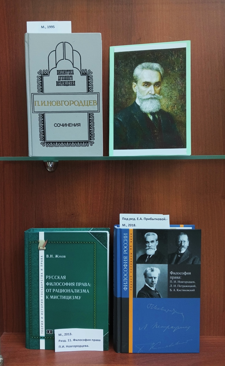 Павел Иванович Новгородцев (1866–1924) — российский ученый-правовед, философ. общественный и политический деятель, один из видных представителей либерализма в России. Преподавал на юридическом факультете Московского университета с 1896 по 1911 г. (с 1904 г. в качестве ординарного профессора по кафедре энциклопедии права и истории философии права). Депутат первой Государственной Думы от Конституционно-демократической (кадетской) партии. После 1920 г. эмигрировал. В 1922 г. основал и возглавил Русский юридический факультет в Праге.