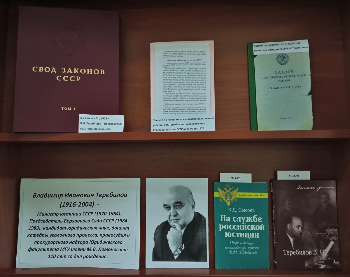 ►Владимир Иванович Теребилов — министр юстиции СССР (1970–1984), Председатель Верховного Суда СССР (1984–1989), кандидат юридических наук, доцент кафедры уголовного процесса, правосудия и прокурорского надзора Юридического факультета МГУ имени М.В. Ломоносова: 110 лет со дня рождения