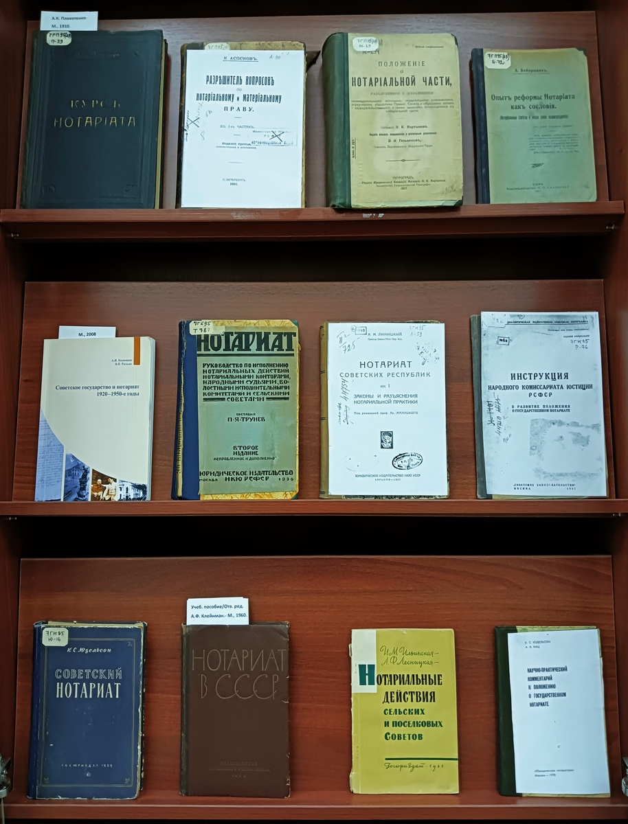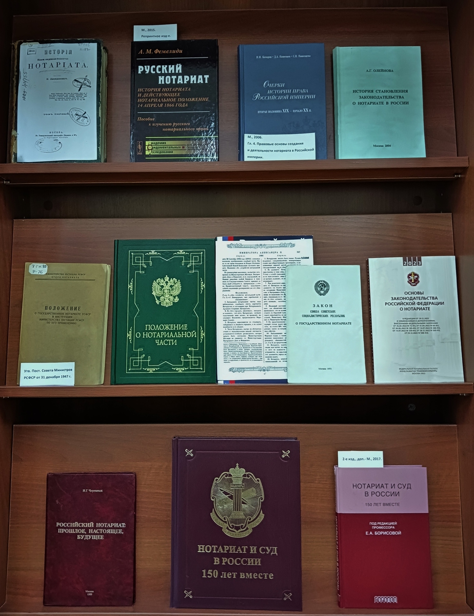 14 апреля 1866 г. император Александр II утвердил «Положение о нотариальной части», которое стало точкой отсчета истории российского нотариата как самостоятельного правового института и основой современного нотариата в России. На выставке представлены правовые акты разных лет и литература по истории и организации нотариата в России с 1866 по 2025 г.