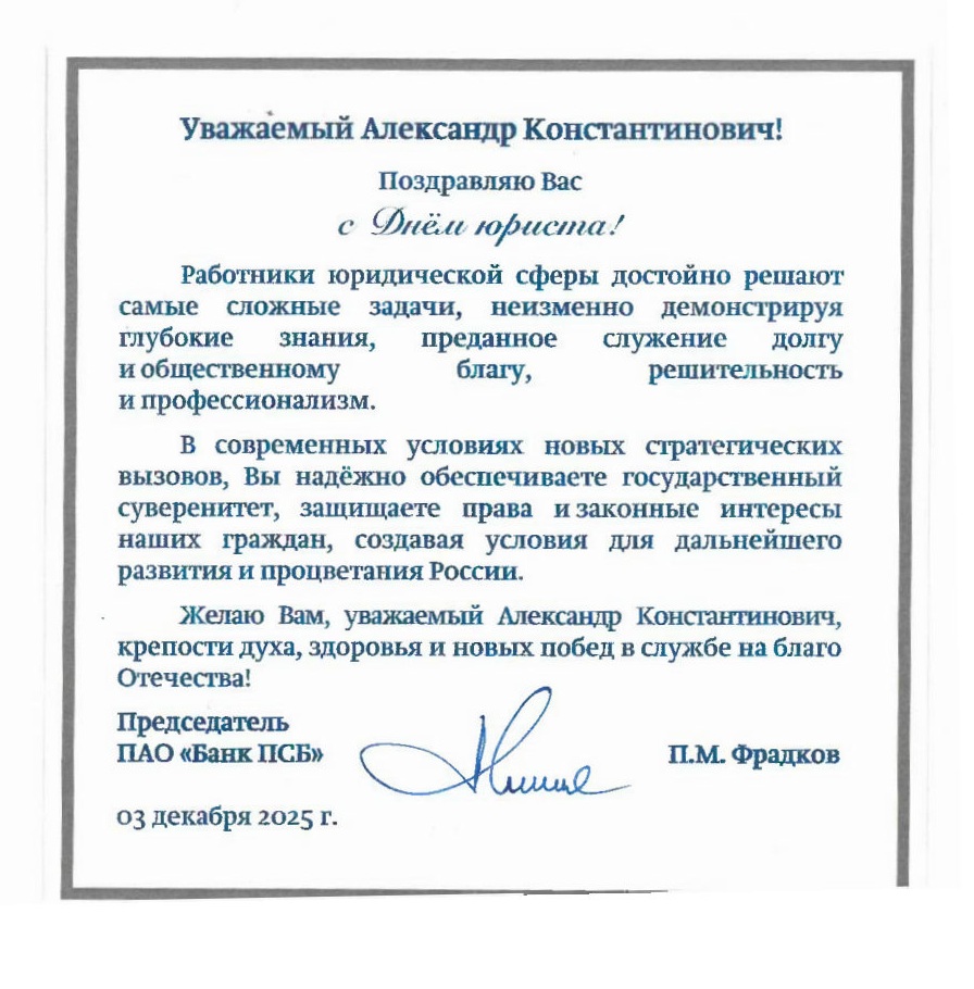 На имя декана Юридического факультета МГУ А.К. Голиченкова поступают поздравления с профессиональным праздником.